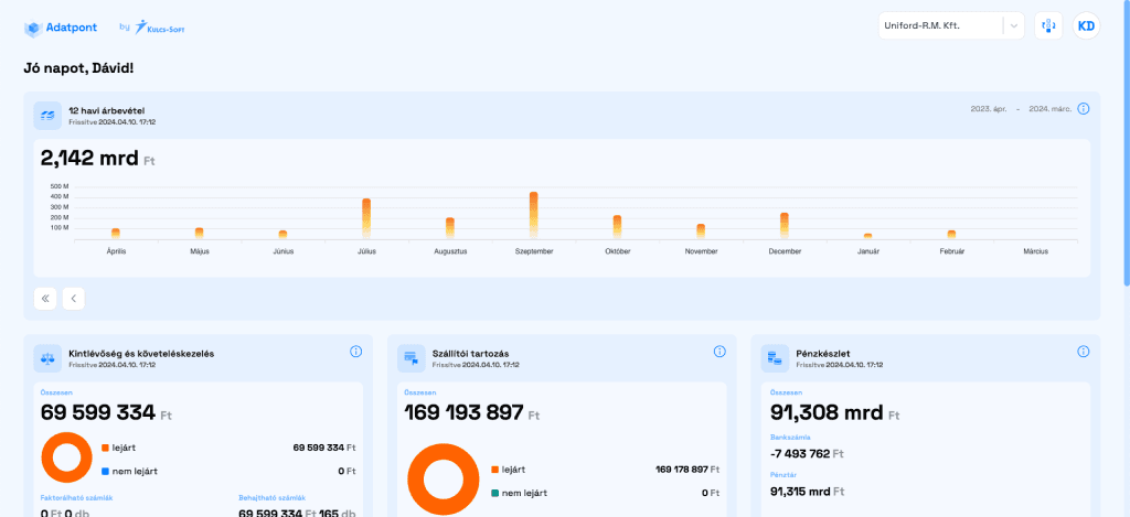 Az Adatpont segítségével a vállalkozások valós időben és egyszerűen tekinthetik át fontos pénzügyi adataikat és kimutatásaikat. Az alkalmazás azonban ennél jóval többet kínál: integrált követeléskezelési és faktoring szolgáltatásai révén segíti a gyorsabb kifizetéseket, miközben csökkenti az adminisztratív terheket.